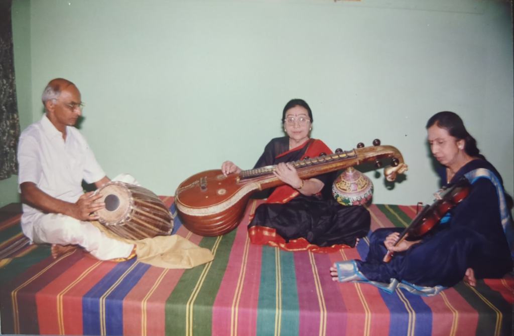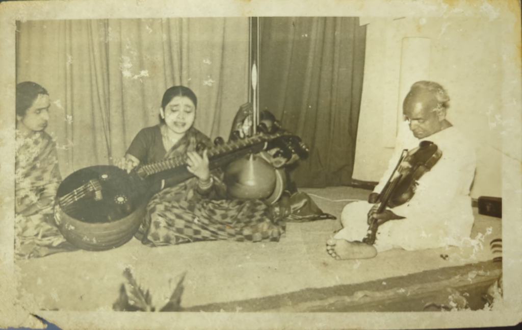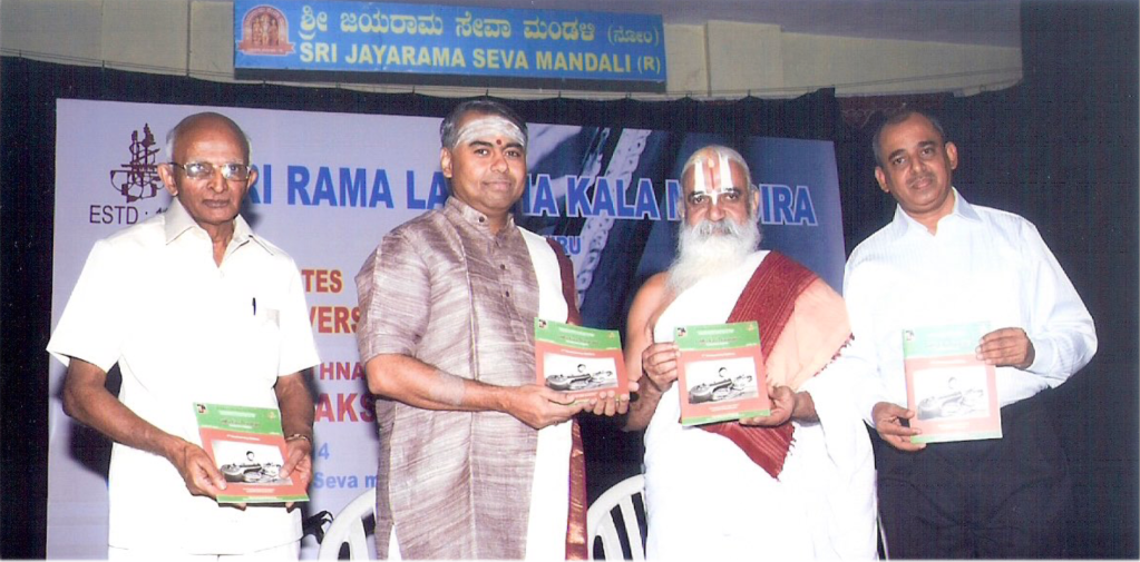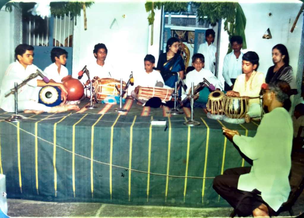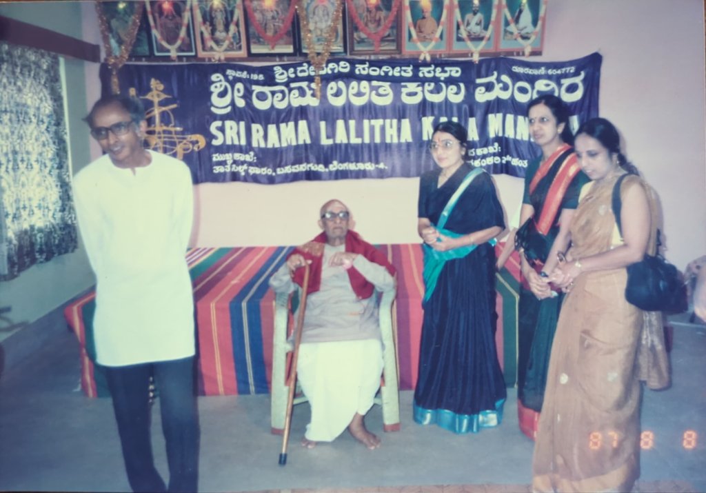 G.V sisters in concert.Semmangudi Srinivasa Iyer walking towards the Open Air AuditoriumG.V.R, G.V.N and G.V.K in concert…K.J Yesudas at the Inauguration of the Concert Hall on 9th January, 1986Students of SRLKM performing a Laya Ensemble under G.V.K’s guidanceG.V.R singing while playing the VeeneG.V.K, R.K Sriram Kumar, Tiru Swamy (Poorvashrama) and editor S. Anand releasing the Special edition of the ‘Lalitha Kala Tarangini’ on M.S Subbulakshmi