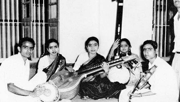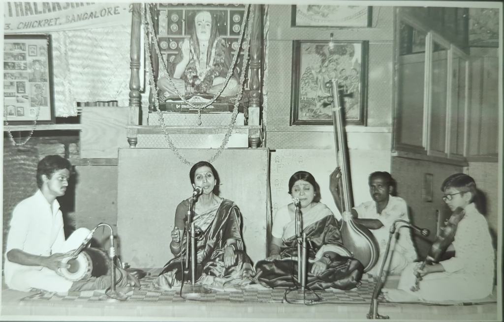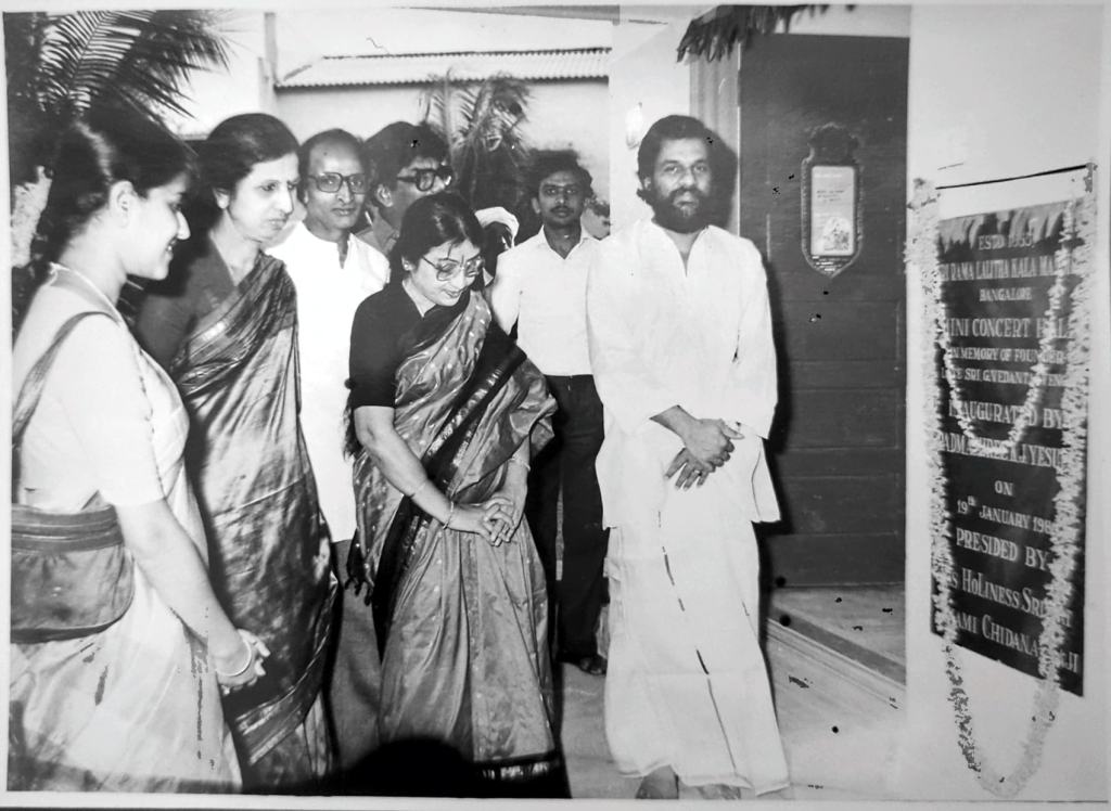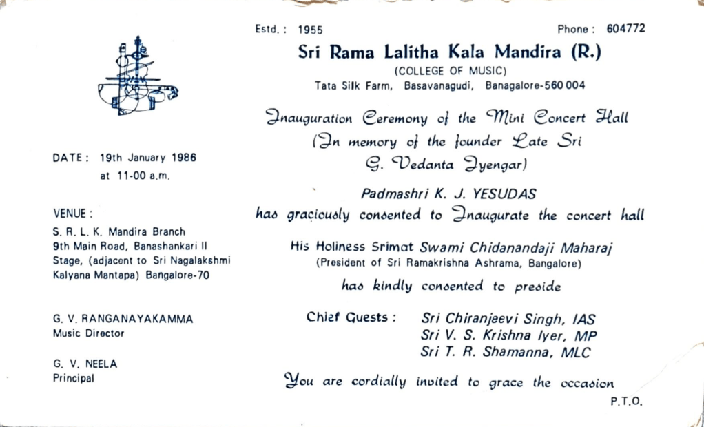 G.V sisters in concert.Inauguration of the Open Air Auditorium with Semmangudi Srinivasa IyerChiranjeevi Singh (IAS) and Swami Chidananda Maharaj (Ramakrishna Mutt) at the inauguration of the SRLKM concert hall The G.V siblings in conversation with K.J YesudasThe Kala Mandira BuildingThe G.V siblings with Lalgudi Jayaraman at the previous premises in Tata Silk Farm