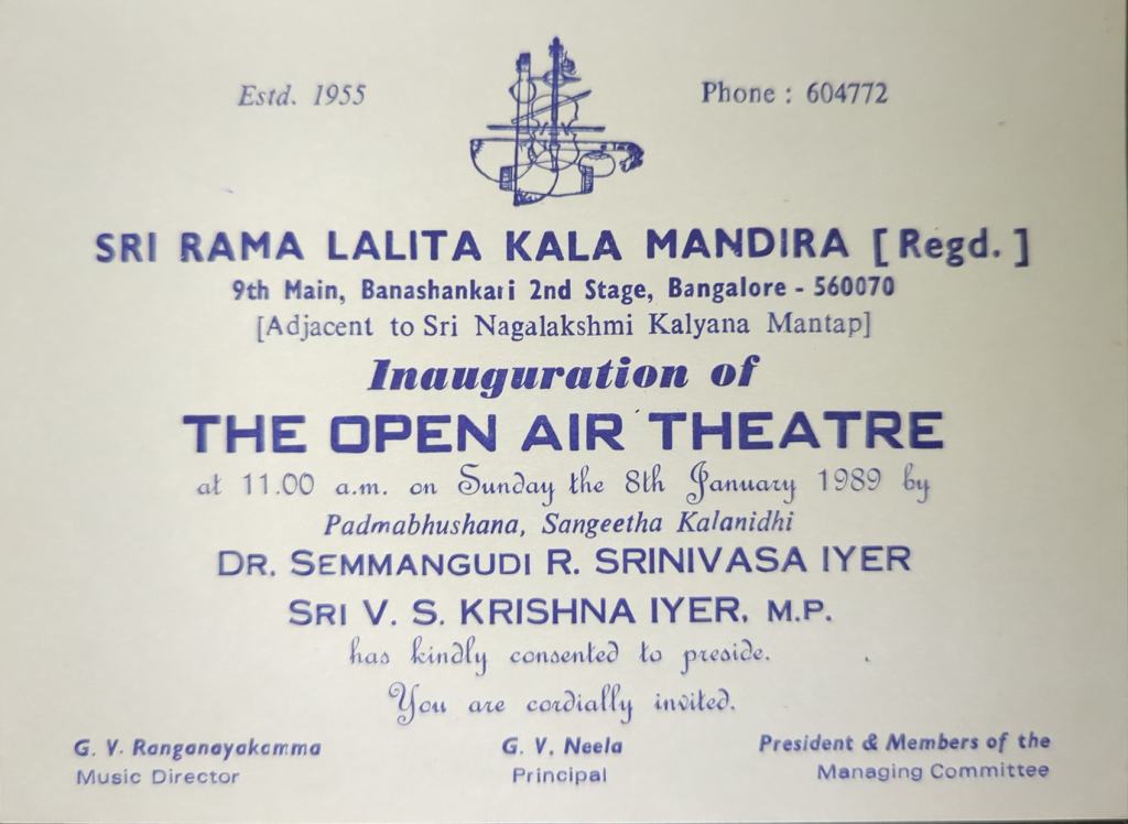 The Kala Mandira team with Maharajapuram Santanam at the inuguration of the first phase of the SRLKM buildingInvite for the inauguration of the Open Air TheatreWith Semmangudi Srinivasa Iyer in the concert hall at SRLKMInvite for the inauguration of the concert hallThe G.V FamilyThe G.V siblings